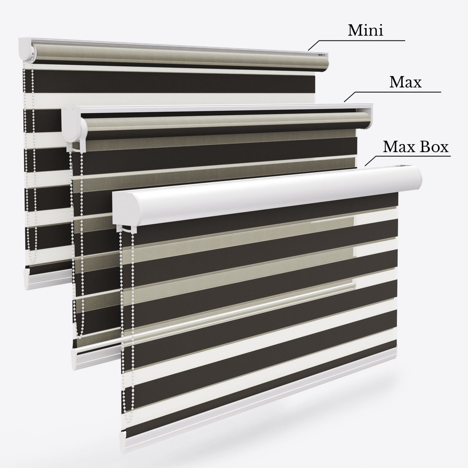 Blackout Импресия Ден и Нощ, познати още като Зебра щори, се изработват по индивидуални размери и спецификации, за да отговарят на особеностите на конкретното пространство. В зависимост от размерите, модел Blackout Delicacy Dark Brown може да бъде съчетан с различни видове механизми, включително с елегантна Макс Кутия, която скрива плата, предпазва го от прах и придава завършен, модерен облик на интериора. Механизмите се предлагат в цветове бял, сив, антрацит и кафяв, с възможност за автоматизация.